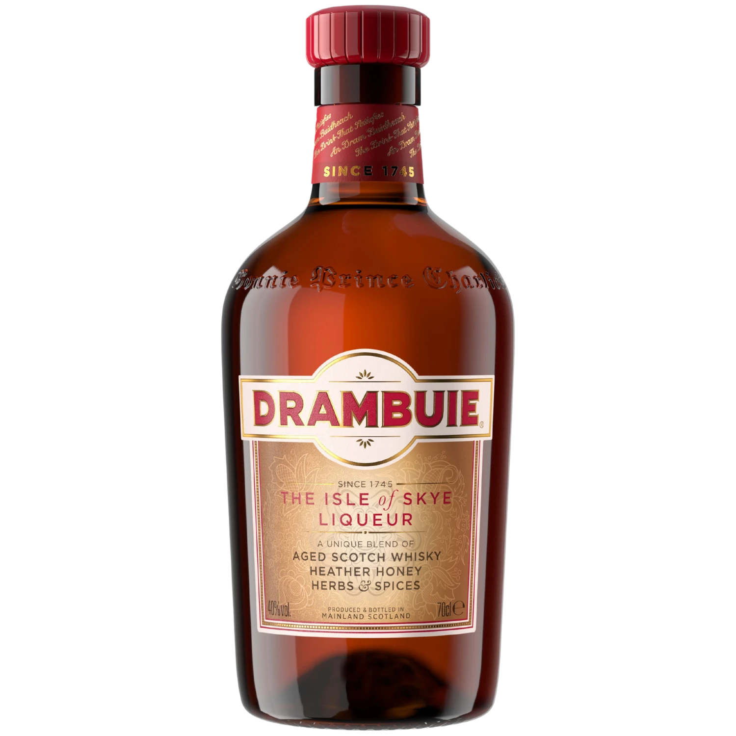 Aus den besten Whiskys der schottischen Highlands wird der Drambuie Whisky Likör kreiert. Dreißig verschiedene Single-Malt-Whiskys vereinen sich mit Grain-Whiskys zu einer perfekten Kreation. Die Whiskys haben mindestens 15 Jahre in ausgesuchten Fässern gelagert und in der Zeit ihre Reife vollendet. Der Drambuie Whisky Likör hat einen Alkoholgehalt von 43 % vol. Nach einem alten Familienrezept, das geheim gehalten wird, wird der Whisky mit Heidehonig und verschiedenen ausgesuchten Kräutern vermählt.