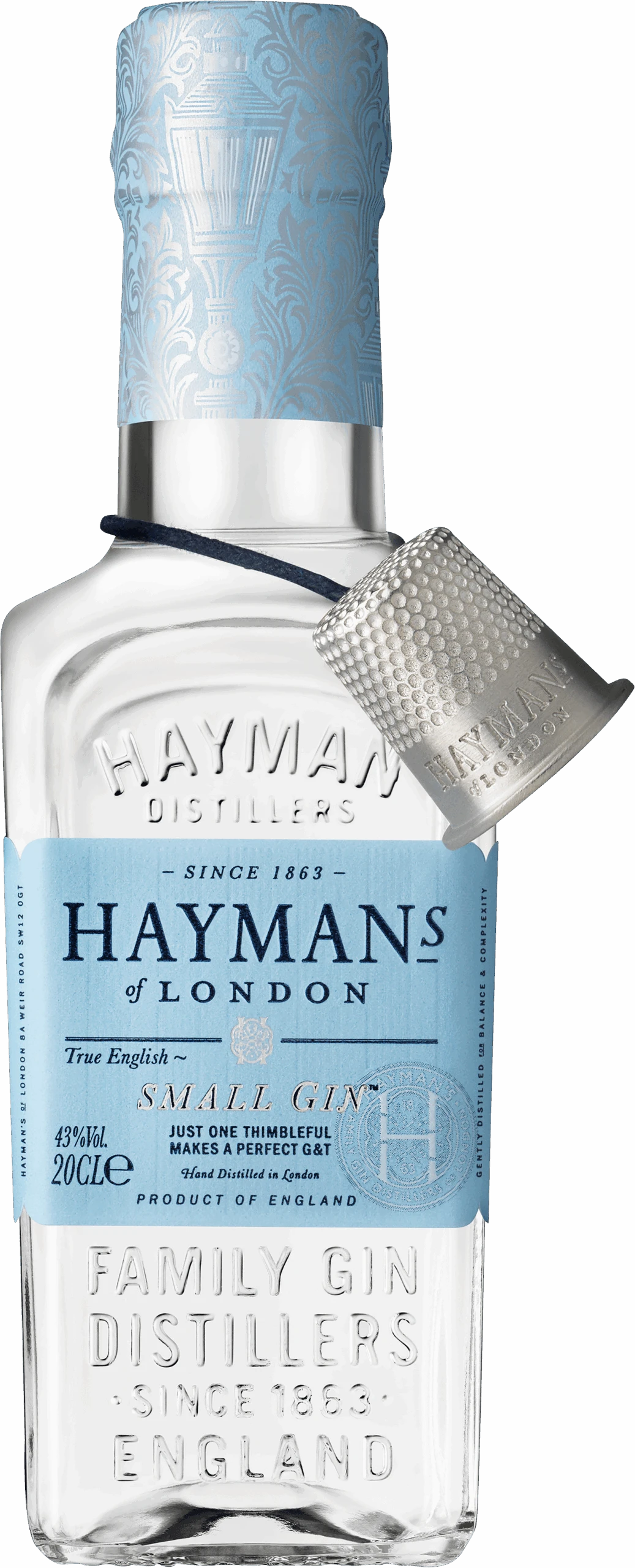 Der Haymans Small Gin aus England kommt für die Bar oder Hausbar in der kleinen Flasche mit 0,2 l Inhalt auf den Markt und nennt sich auch „klein“, weil er theoretisch nur 20 % des Alkoholgehalts von vergleichbaren Spirituosen bei einem Serving besitzt. Dennoch setzt er auf eine normal erscheinende Trinkstärke von 43 % vol. Das Erfolgsgeheimnis liegt darin, dass er so kräftige Botanicals und ein so konzentriertes Aroma bietet, dass man bis zu 80 % weniger beim Mixen von Drinks wie Gin & Tonic verwenden kann als bei herkömmlichem Wacholderschnaps. Der clevere Haymans Small Gin in der 20 cl Flasche hilft also auch beim Sparen. Schon 5 cl sollen ausreichen für einen G&T – und aus diesem Grund liefert der Hersteller eine Art Fingerhut zum Abmessen dieser geringen Dosierung mit.