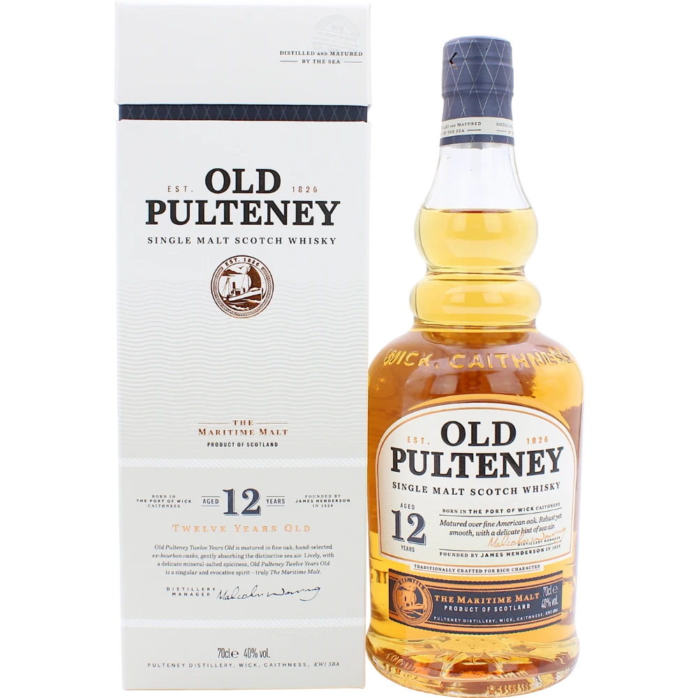 Die Destillerie im nordschottischen Ort Pulteney kennt ein Aushängeschild ihrer Produktionsreihe: Nämlich den Old Pulteney 12 Jahre. Dieser wird in luftgetrockneten und handausgewählten, früheren Bourbonfässern über seine gesamte Reifezeit hinweg gelagert. Bereits bei mehreren internationalen Wettbewerben wurde er mit Goldmedaillen bedacht. Was aber macht den Old Pulteney 12 Jahre so attraktiv und zu einem Geschmackfest für Kenner? 40 Prozent an Alkohol behält er bei der Abfüllung in einer tiefen Variation bernsteinfarbener Tönung.