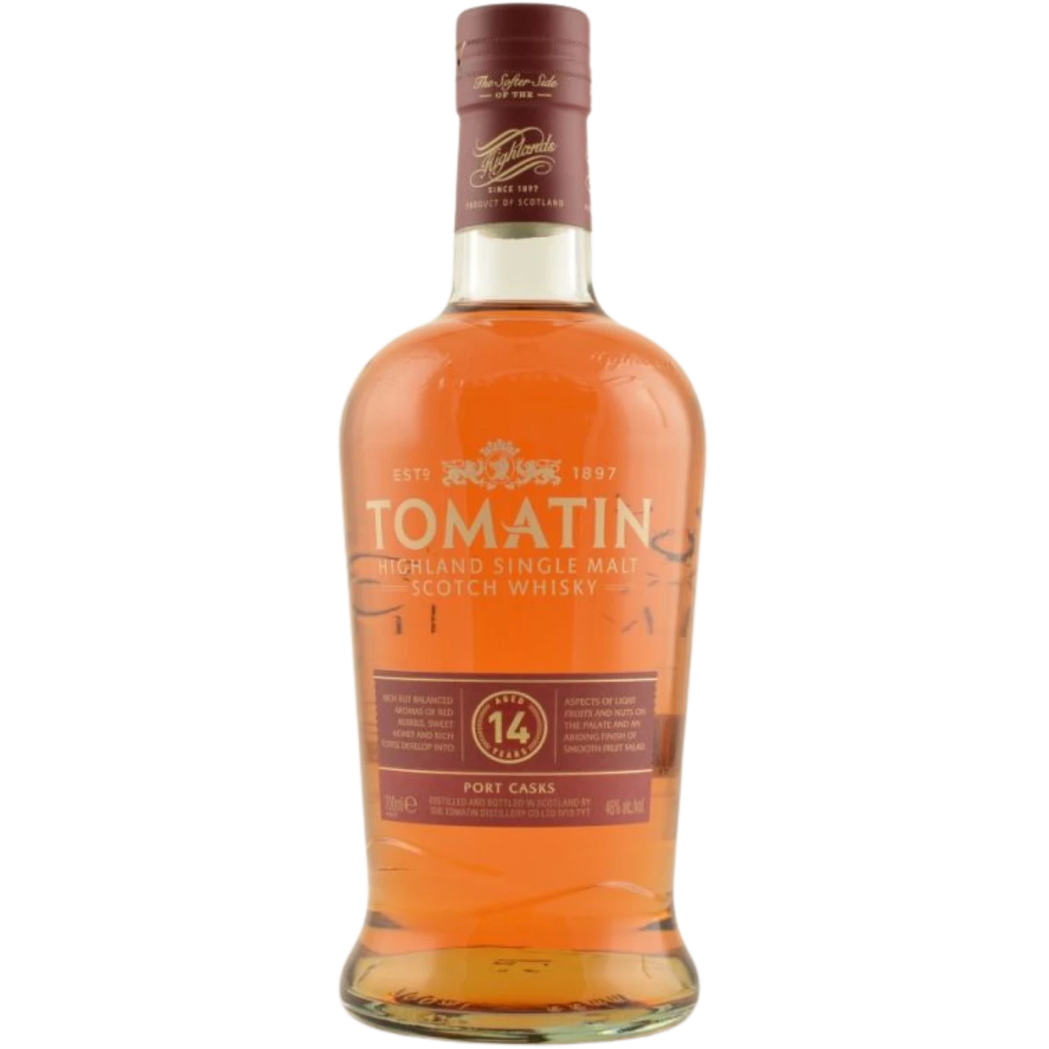 Im Aroma steht der finessereiche Tomatin 14 Jahre Highland Single Malt Whisky für Noten von Frucht. Man fühlt sich an Trauben und rote Beeren erinnert, was der Einfluss des Finishing im Portweinfass ist. Vanille, Eiche und ein Hauch von Gewürzen wie weißem Pfeffer machen das kräftige Bouquet noch komplexer. Im Geschmack offenbart der reichhaltige Tomatin 14 Jahre Highland Single Malt Whisky saftige Erdbeeren, die mit dunkler Schokolade überzogen wurden. Ein Unterton von Muffins, Walnüssen und Haselnüssen schwingt mit. Marmelade und Sahne gehen langsam in Eiche über. Das Finish ist fruchtbetont. Dieser großzügige, verführerische Scotch tanzt aus der Reihe und sollte pur oder „on the rocks“ getrunken werden. Der Tomatin 14 yr Portwood Finish Highland Single Malt Scotch Whisky kam 2014 auf dem Markt und gewann 2015 Gold bei der „San Francisco World Spirits Competition“.